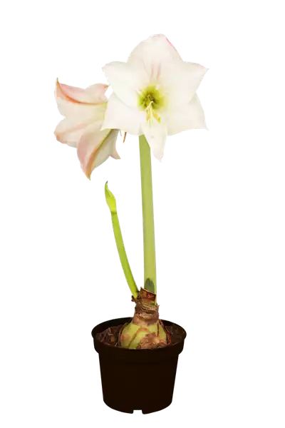 Die Amaryllis (Hippeastrum) in den Trendfarben Weiß und Hellgrün gibt sich erhaben und stolz. Mit ihr können Sie Esstische und Kommoden modern und festlich schmücken.